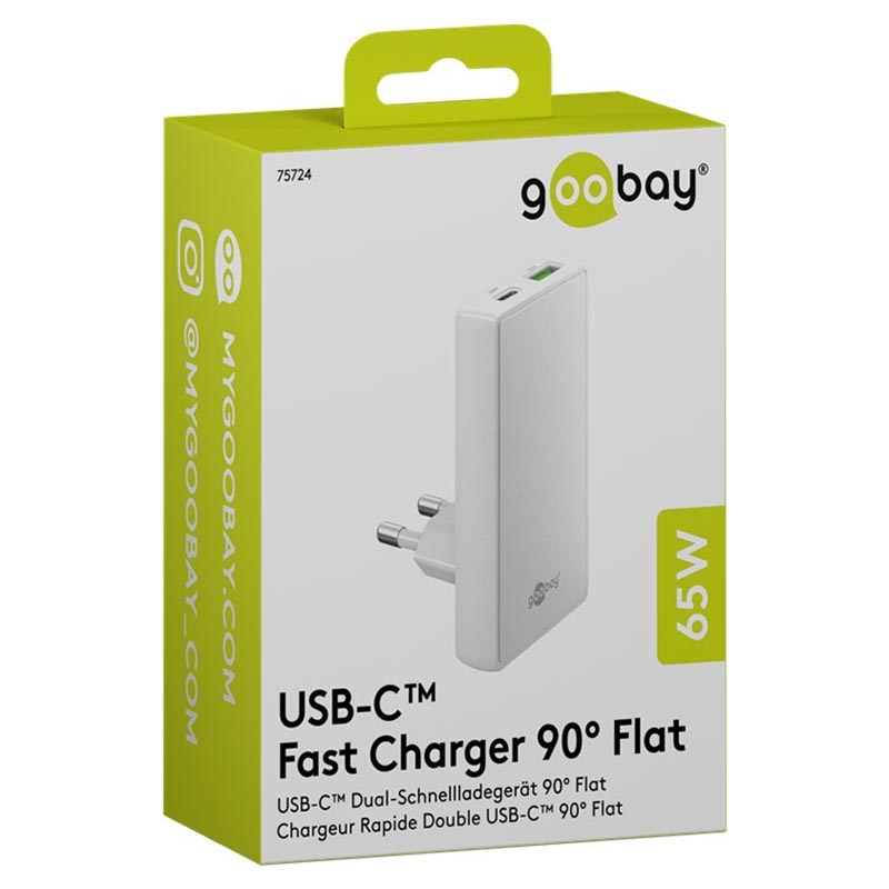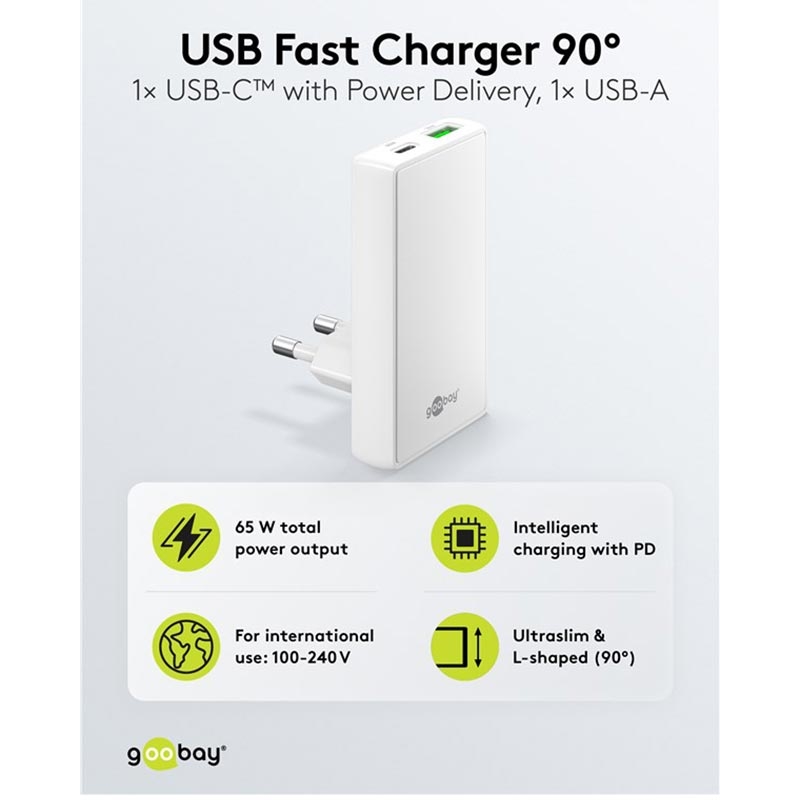 Goobay GaN Duales Schnellladegerät 90° Flach 65W - Ultra-schlankes Wand-Ladegerät mit USB-C & USB-A Anschlüssen
