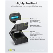 Die mit einem 3,7V 2000mAh Li-Ion 18650 Akku betriebene Leuchte bietet bis zu 30 Stunden Leuchtdauer mit einer vollen Ladung. Der austauschbare Akku verlängert die Lebensdauer und Nachhaltigkeit des Produkts.