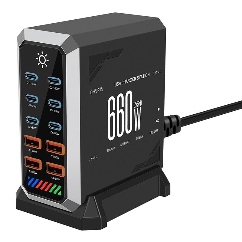 HHW HW18 660W GaN Multi-Port Desktop-Ladegerät - Intelligente USB-Netzteilstation mit Digitalanzeige - 6xUSB-C, 4xUSB-A