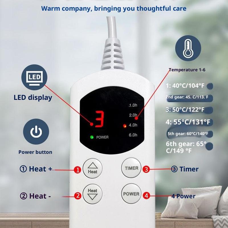 Passen Sie Ihren Komfort mit sechs Temperaturstufen von 40 °C bis 65 °C (104 °F - 149 °F) an. Mit der intuitiven LED-Steuerung können Sie die perfekte Intensität für Ihre Bedürfnisse wählen, während die vier automatischen Timer-Einstellungen (1 Std., 2 Std., 4 Std., 6 Std.) für Sicherheit und Energieeffizienz bei längerem Gebrauch sorgen.