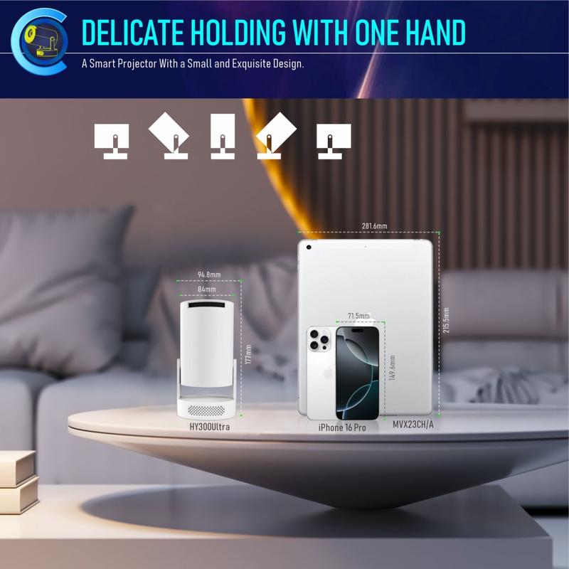 Der tragbare Miniprojektor HY300Ultra ist ein kompakter, intelligenter Projektor, der überall für Unterhaltung sorgt. Mit integriertem Android 11, WiFi 6 und Bluetooth-kompatiblem 5.4 liefert er ein reibungsloses, kabelloses Fernseherlebnis, egal ob Sie zu Hause, auf Reisen oder für einen schnellen Filmabend sind.