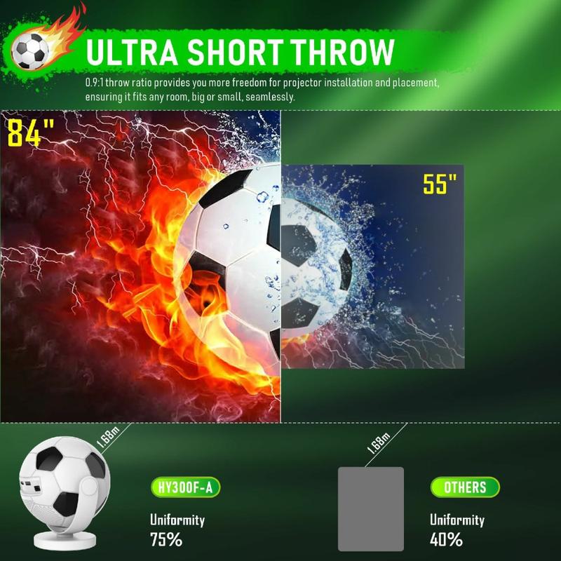 Holen Sie sich mit dem tragbaren Projektor HY300F in Fußballform Großbildunterhaltung auch in kleinere Räume. Dieser kompakte Smart-Projektor besticht durch sein markantes, vom Fußball inspiriertes Design und verbindet verspielten Stil mit praktischen Home-Entertainment-Funktionen. Ganz gleich, ob Sie Filme streamen, Live-Sport verfolgen, Serien genießen oder Inhalte an die Wand oder Decke Ihres Schlafzimmers projizieren möchten - dieses Modell bietet eine einfache und flexible Möglichkeit, zu Hause ein noch intensiveres Seherlebnis zu schaffen.