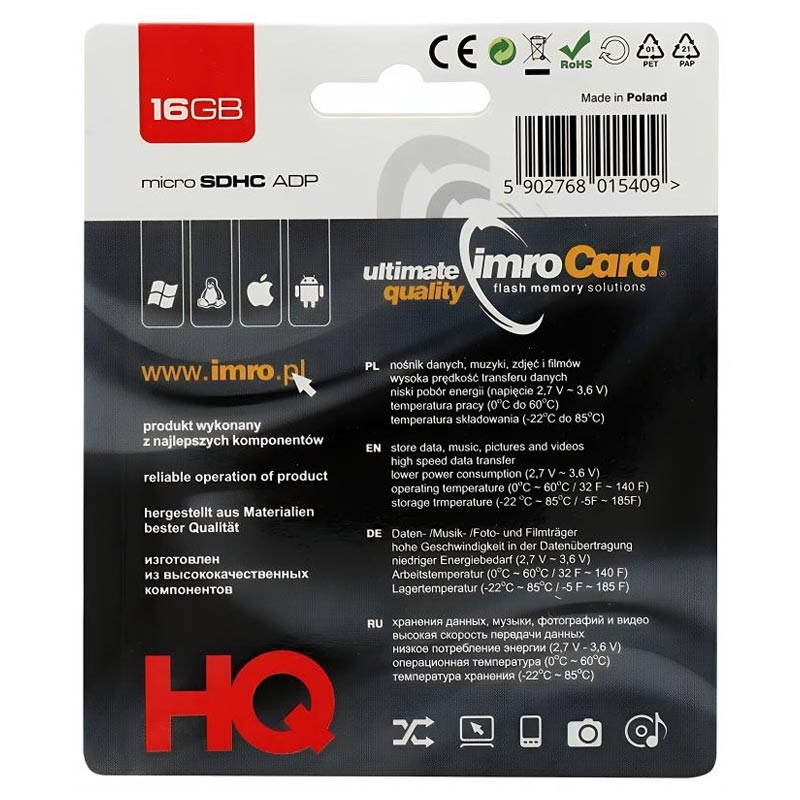 Erweitern Sie den Speicher Ihres Geräts mit der IMRO microSDHC 16GB Speicherkarte. Sie wurde für den täglichen Gebrauch entwickelt und bietet zuverlässige Leistung für Smartphones, Tablets, Kameras und andere kompatible Geräte. Mit schnellen Lesegeschwindigkeiten von bis zu 85 MB/s und Schreibgeschwindigkeiten von bis zu 43 MB/s unterstützt sie reibungslose Dateiübertragungen, Fotospeicherung und Full-HD-Videoaufnahmen. Der mitgelieferte SD-Adapter ermöglicht die einfache Verwendung in Geräten mit einem Standard-SD-Kartensteckplatz.