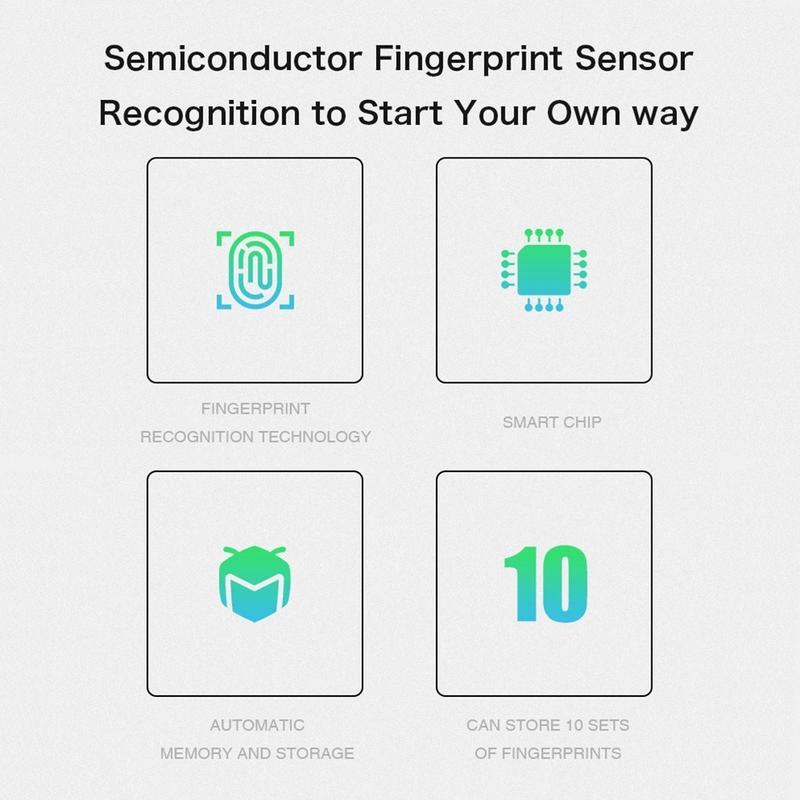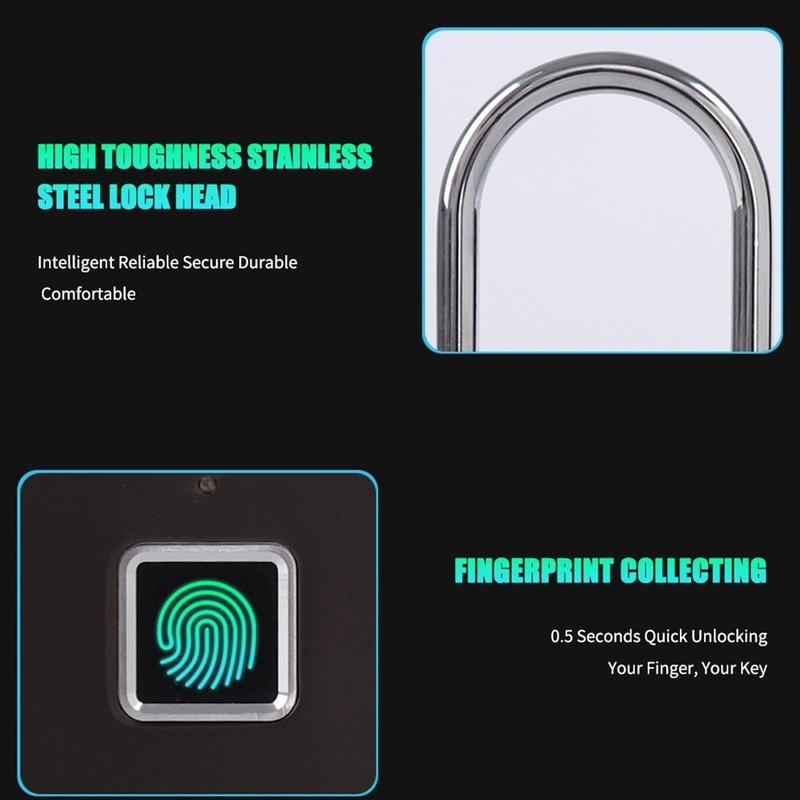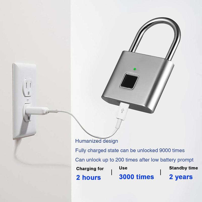 Dieses Mini-Vorhängeschloss besteht aus einem Gehäuse aus Zinklegierung und einem hochfesten Schlossbügel aus Edelstahl und ist für den zuverlässigen täglichen Gebrauch ausgelegt. Es kann bis zu 10 Fingerabdrücke speichern, darunter Administrator- und normale Benutzereingaben, und der wiederaufladbare Akku bietet eine lange Standby-Zeit mit praktischer USB-Aufladung. Dank seiner kompakten Größe lässt es sich leicht transportieren, während das Fingerabdrucksystem hilft, die üblichen Probleme mit verlorenen Schlüsseln und vergessenen Codes zu vermeiden.