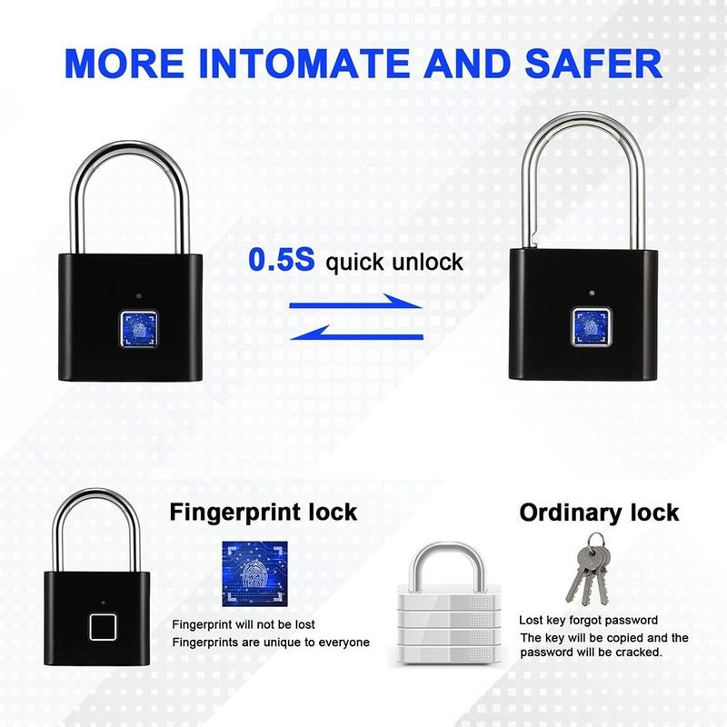 Sorgen Sie mit diesem intelligenten Fingerabdruck-Vorhängeschloss für mehr Sicherheit bei Ihren persönlichen Gegenständen - ein kompaktes, schlüsselloses Schloss, das für den täglichen Komfort entwickelt wurde. Anstelle von Schlüsseln oder Passwörtern wird es per Fingerabdruck entriegelt, was es zu einer praktischen Wahl für Schränke, Rucksäcke, Koffer, Spinde im Fitnessstudio und Aufbewahrungsboxen macht.
