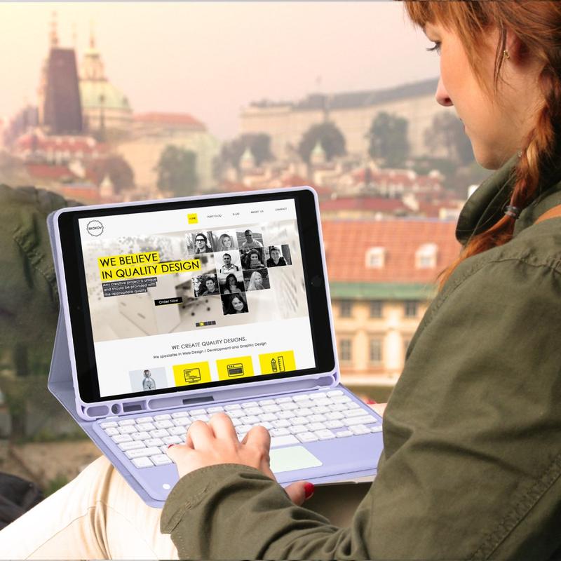 Erweitern Sie Ihr iPad Air 11 2026/2025/2024, iPad Air 2022/2020 mit der Bluetooth-Tastaturhülle, einem multifunktionalen 2-in-1-Zubehör, das Schutz, Produktivität und Stil vereint. Diese elegante Hülle aus hochwertigem Polyurethan bietet umfassenden Schutz vor Kratzern, Stößen und Fingerabdrücken und sieht dabei auch noch professionell aus. Die Bluetooth-Tastatur lässt sich kabellos verbinden und ermöglicht ein flüssiges, reaktionsschnelles Tippen, während das integrierte Touchpad eine Multi-Gesten-Steuerung für müheloses Navigieren unterstützt. Dank der beleuchteten Tastatur können Sie auch in schwach beleuchteten Umgebungen bequem tippen. Der integrierte, verstellbare Ständer bietet einen ergonomischen Betrachtungswinkel und eignet sich somit perfekt zum Tippen, Streamen oder Lesen. Diese Tastaturtasche wurde für den Geschäfts-, Reise- oder Alltagsgebrauch entwickelt und verwandelt Ihr Tablet in eine tragbare Workstation.