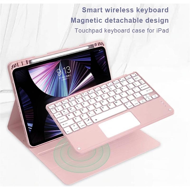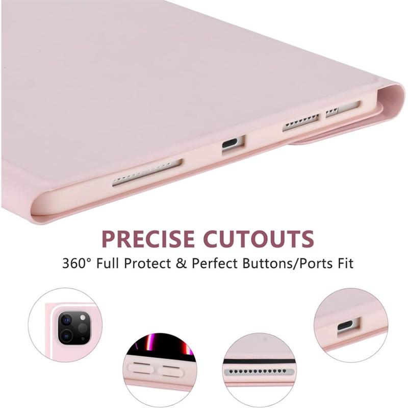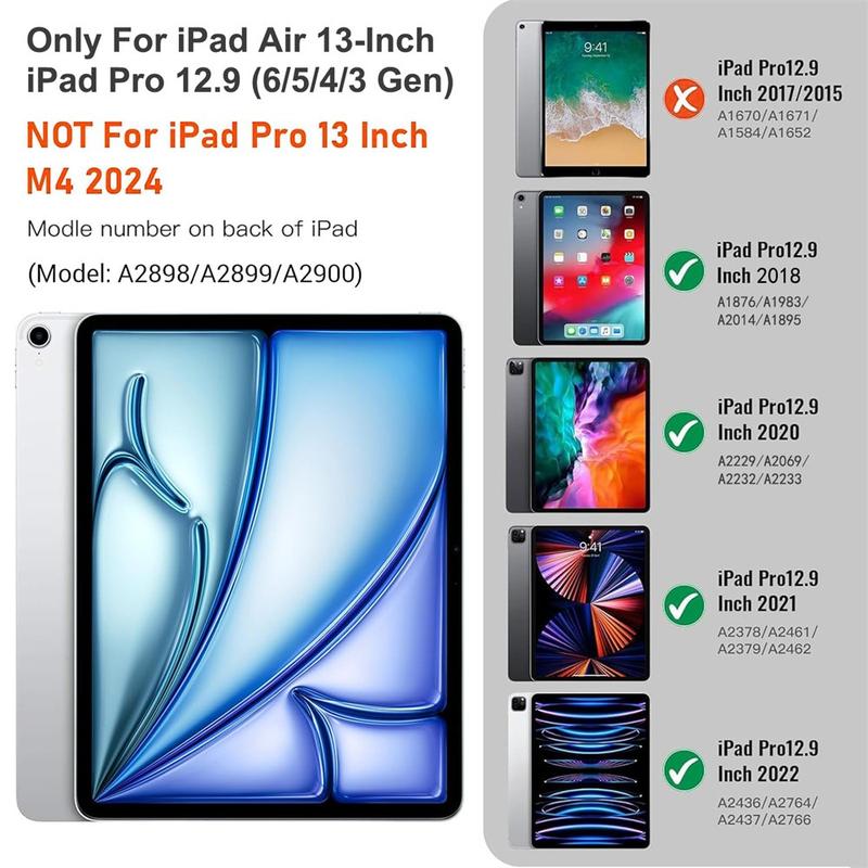 Erweitern Sie Ihr iPad Air 13 2026/2025/2024, iPad Pro 12.9 2022/2021/2020/2018 mit der Bluetooth-Tastaturhülle, einem multifunktionalen 2-in-1-Zubehör, das Schutz, Produktivität und Stil vereint. Diese elegante Hülle aus hochwertigem Polyurethan bietet umfassenden Schutz vor Kratzern, Stößen und Fingerabdrücken und sieht dabei auch noch professionell aus. Die Bluetooth-Tastatur lässt sich kabellos verbinden und ermöglicht ein flüssiges, reaktionsschnelles Tippen, während das integrierte Touchpad eine Multi-Gesten-Steuerung für müheloses Navigieren unterstützt. Dank der beleuchteten Tastatur können Sie auch in schwach beleuchteten Umgebungen bequem tippen. Der integrierte, verstellbare Ständer bietet einen ergonomischen Betrachtungswinkel und eignet sich somit perfekt zum Tippen, Streamen oder Lesen. Diese Tastaturtasche wurde für den Geschäfts-, Reise- oder Alltagsgebrauch entwickelt und verwandelt Ihr Tablet in eine tragbare Workstation.