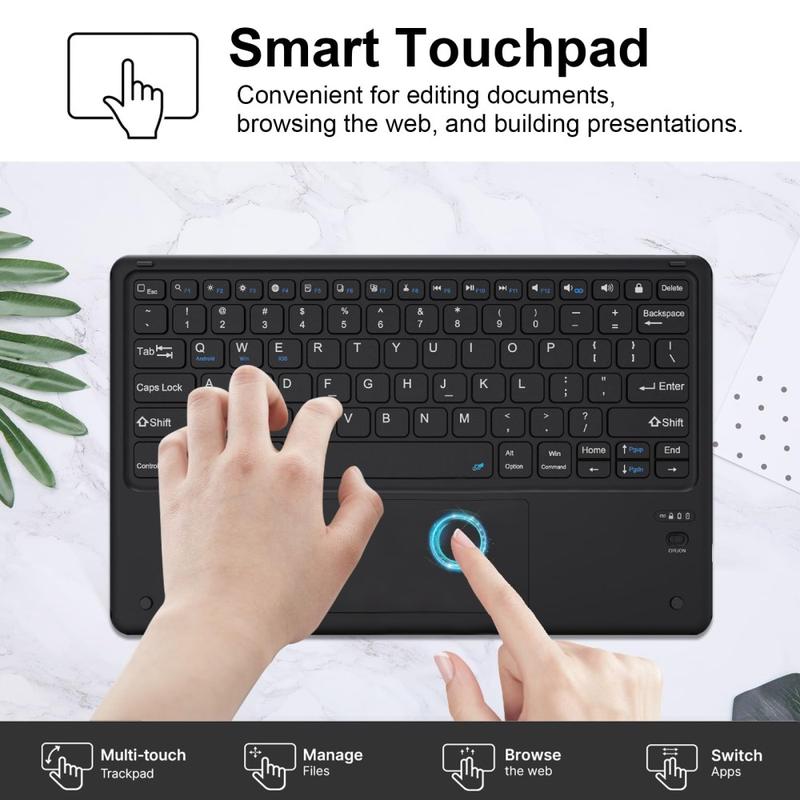 - Die Bluetooth-Tastatur verfügt auch über ein QWERTY-Layout und einen eingebauten Akku
