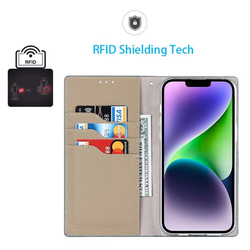 Für iPhone 14 RFID-blockierender Kartensteckplatz, Brieftasche, Telefonhülle, Litschi-Textur, echter Lederständer, automatisch absorbierte Schutzhülle