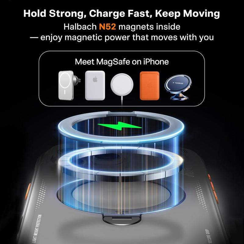 Dank der Halbach-Array-Technologie mit hochwertigen N52SH-Neodym-Magneten bietet das Gehäuse eine bis zu 200 % stärkere Magnetkraft. Dies gewährleistet eine zuverlässige Befestigung und Aufladung mit allem MagSafe-Zubehör.
