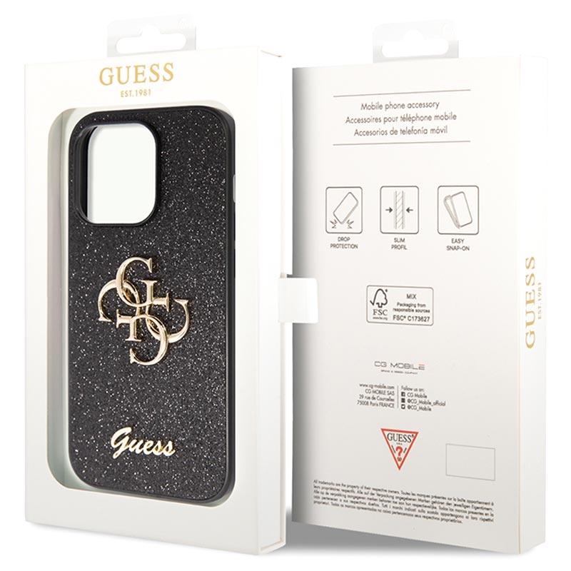- Spektakuläre Guess Fixed Glitter 4G Metal Logo-Hülle für iPhone 15 Pro Max