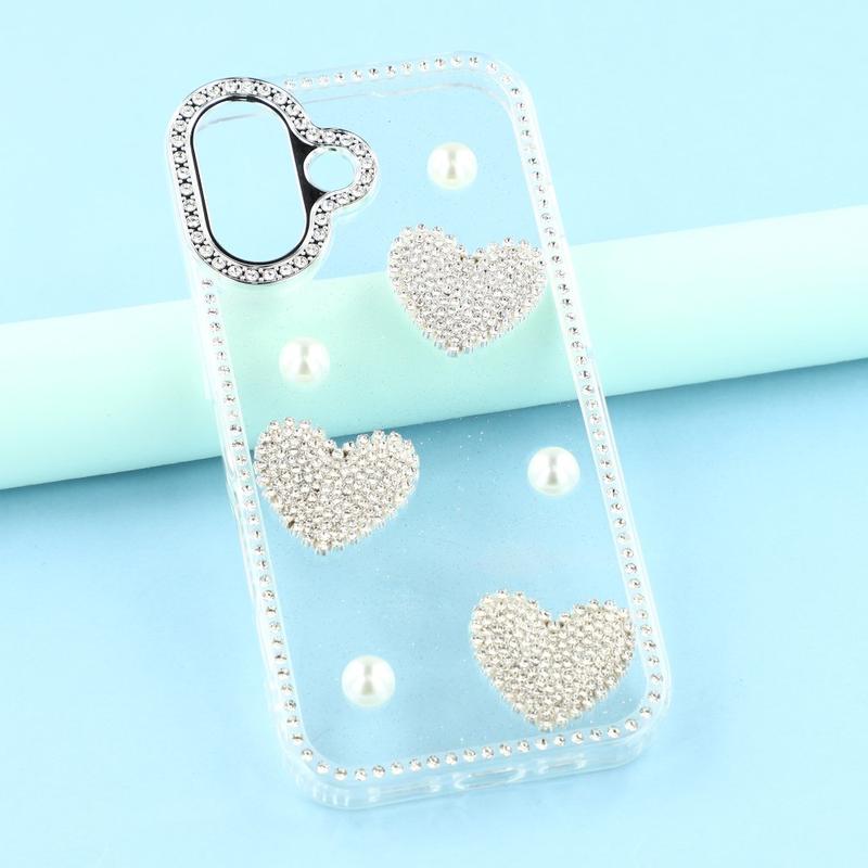 Diese iPhone 16 Hülle kombiniert zuverlässigen Schutz im Alltag mit glamourösem Stil. Mit schimmernden Strasssteinen an den Rändern und funkelnden Perlenherzen auf der Rückseite verwandelt sie dein iPhone 16 in ein modisches Accessoire und schützt es gleichzeitig vor Kratzern und Stößen.