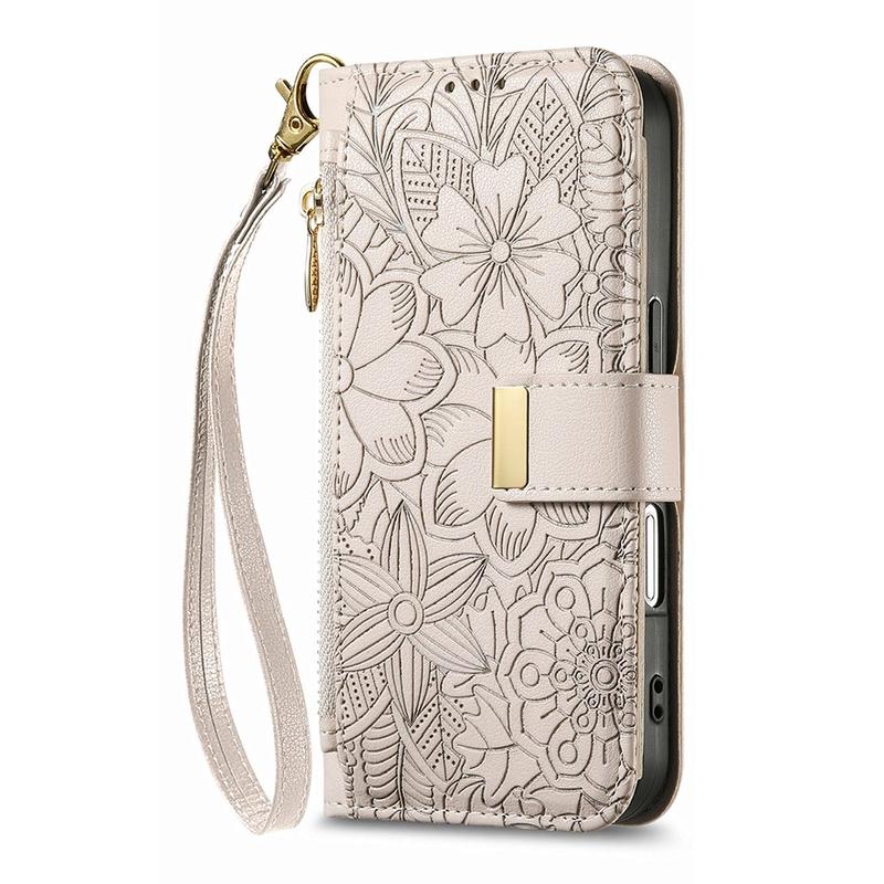 Wallet Hülle mit Blumen und Blattmuster mit Reißverschlusstasche & Handgelenkband für iPhone 16