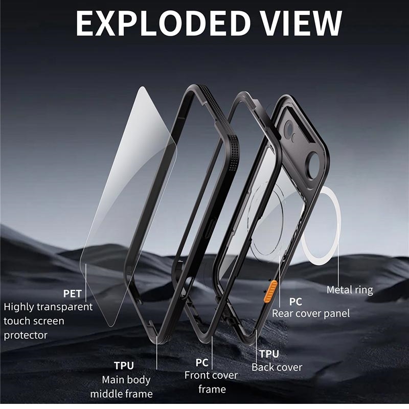 - MagSafe-Kompatibilität: Eingebauter Magnetring unterstützt kabelloses Laden mit MagSafe und Zubehör, ohne dass das Gehäuse entfernt werden muss.