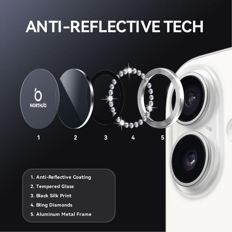 Verleihen Sie Ihrem iPhone 17 mit dem NORTHJO Kameraobjektivschutz Glanz und Schutz. Mit schimmernden Strasssteinen und präzisionsgeschliffenem, gehärtetem Glas schützt er Ihr Kameraobjektiv vor Kratzern, Staub und Stößen und verleiht ihm einen Hauch von Eleganz und Luxus.