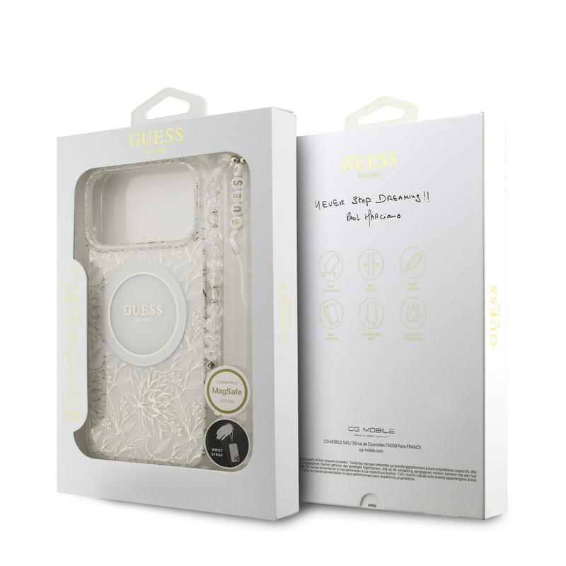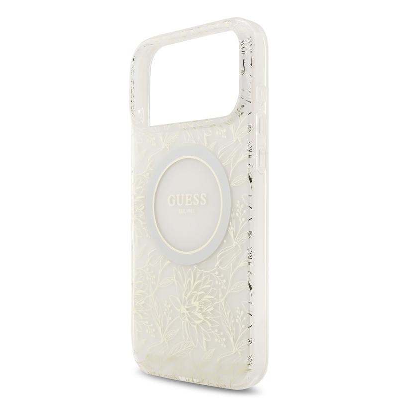 Guess IML Flowers Allover Electro Hülle mit Perle Riemen für iPhone 17 Pro Max - MagSafe-kompatibel