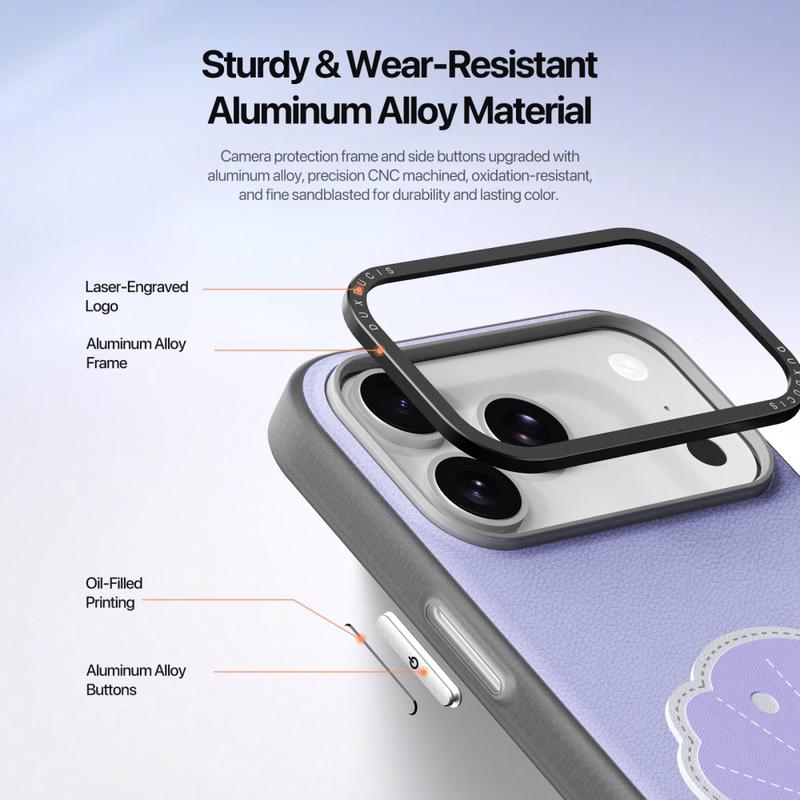 Der Kameraschutzrahmen und die seitlichen Tasten sind aus einer Aluminiumlegierung gefertigt, präzise CNC-gefräst und mit feinem Sandstrahlen veredelt. Dies sorgt für eine lang anhaltende Farbe, Haltbarkeit und eine hochwertige Haptik, die durch dezente lasergravierte Details noch verstärkt wird.
