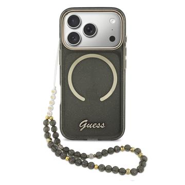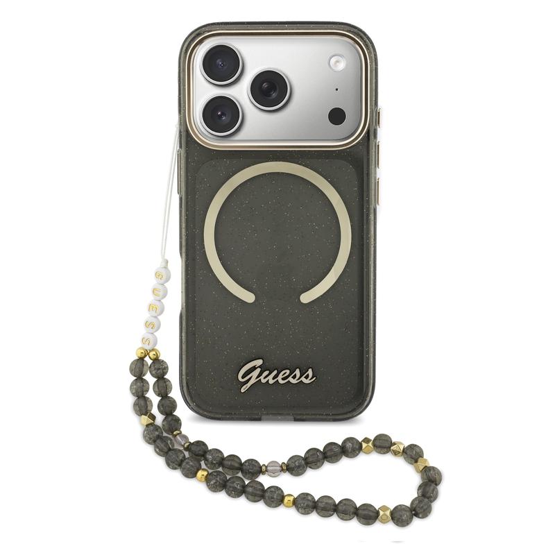 Guess IML Glitter Script Armband MagSafe Hülle für iPhone 17 Pro - Glitzernde Rückseite mit Handgelenkband, PC+TPU-Schutz, MagSafe-kompatibel