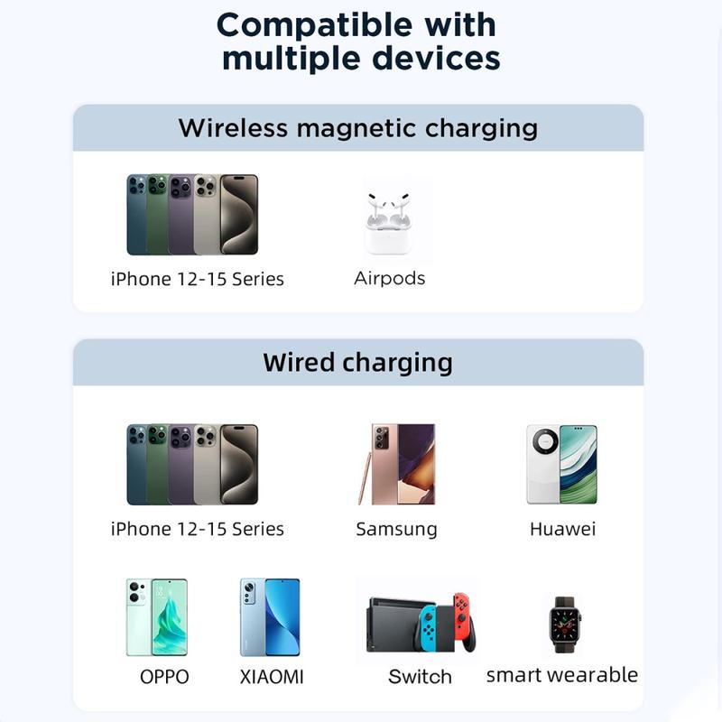 Kommt mit einem abnehmbaren Kabel, kann drei Geräte mit einem Kabel aufladen, einschließlich für Apple/Android-Geräte/Selbstaufladung