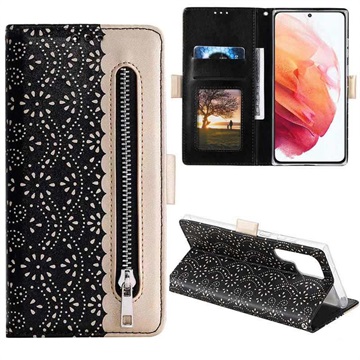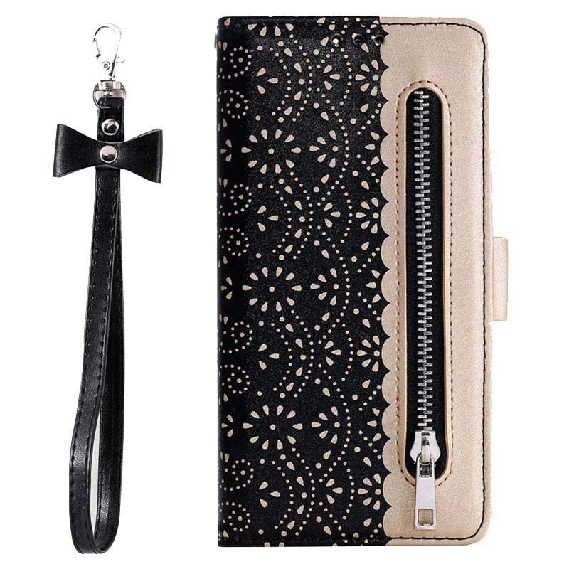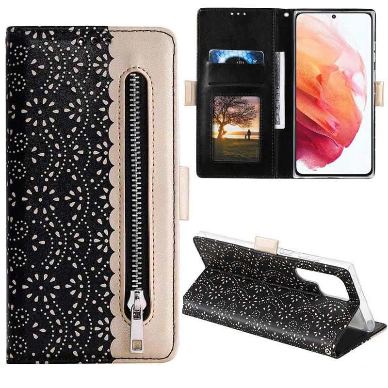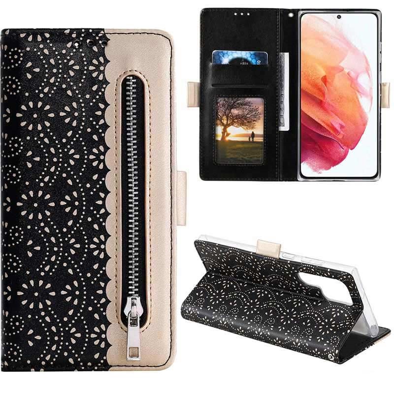 Halten Sie Ihr edles Samsung Galaxy S22 Ultra 5G in perfektem Zustand mit dieser modischen Tasche mit Spitzenmuster. Neben Ihrem Telefon können Sie alle wichtigen Karten und Ihr Geld in einer separaten Geldtasche aufbewahren.