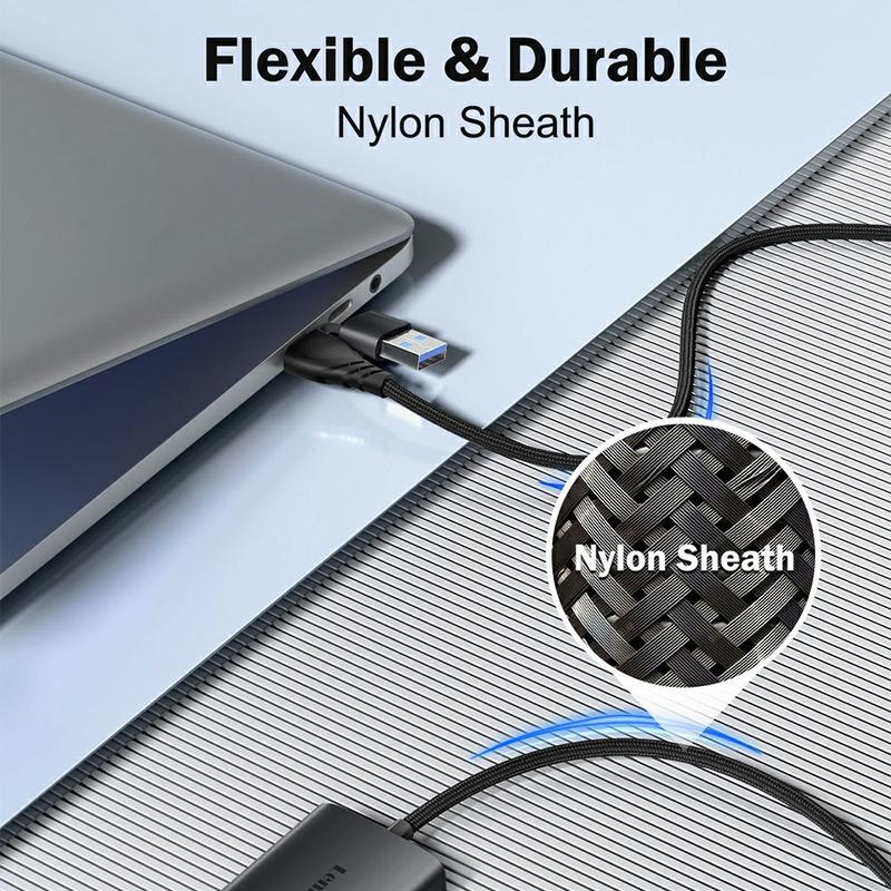 Der Adapter verfügt über ein nylongeflochtenes Kabel, das sich nicht verheddern und nicht ziehen lässt, was die Langlebigkeit erhöht. Das kompakte Gehäuse des Adapters und die Kabellänge von 60 cm machen es einfach, ihn in einer Laptoptasche oder einem Rucksack mitzunehmen.