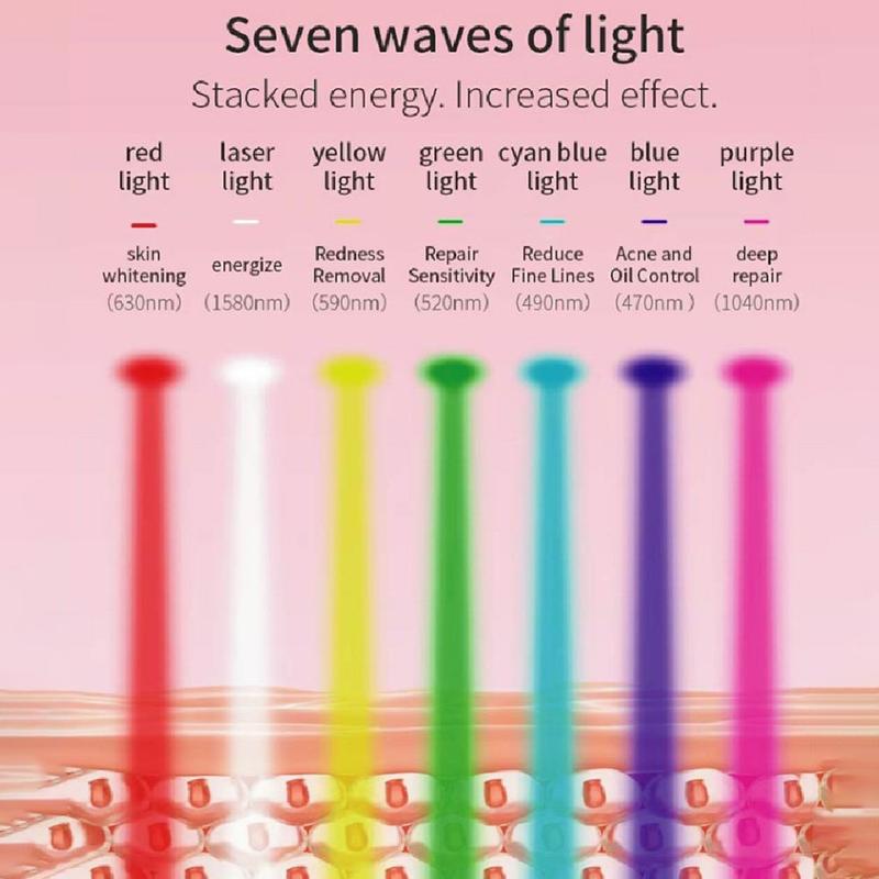 - 7-Farben-LED-Therapie - Enthält rotes (630nm), blaues (460nm), grünes (515nm), violettes, gelb-oranges, cyanfarbenes und weißes Licht, um verschiedene Hautprobleme anzugehen.
