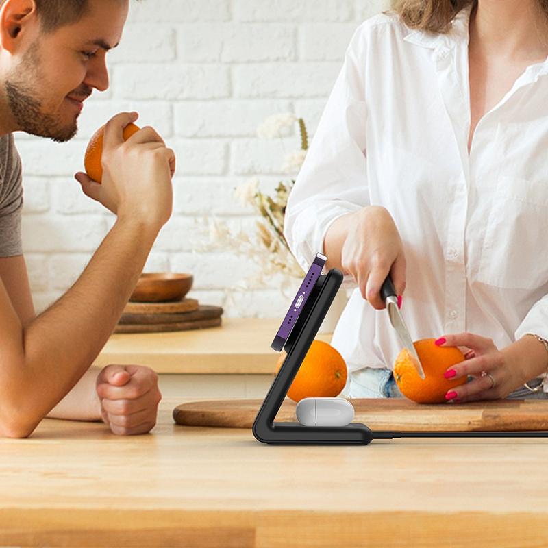 Laden Sie Ihr iPhone und Ihre AirPods gleichzeitig auf, ohne dass Sie mehrere Kabel benötigen. Die eingebauten Magnete sorgen für einen perfekten Halt und garantieren ein effizientes und sicheres Aufladen zu jeder Zeit.