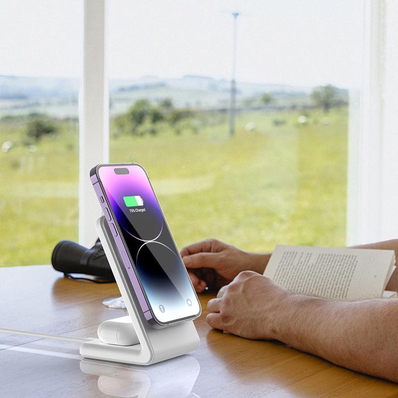 Das M2A 2-in-1 magnetische kabellose Ladegerät ist ein schlankes und leistungsstarkes Tischgerät, mit dem Sie Ihr iPhone und Ihre AirPods gleichzeitig aufladen können. Mit seiner präzisen magnetischen Ausrichtung, dem vertikalen Design und den zertifizierten Sicherheitsstandards ist es der ideale Alltagsbegleiter für zu Hause, im Büro oder im Bett.