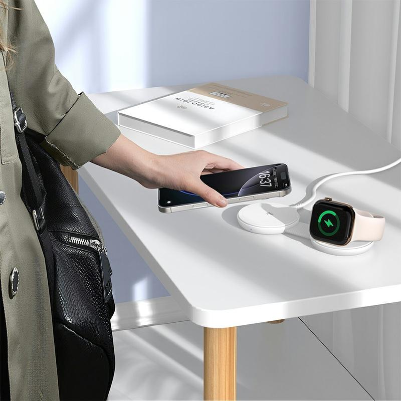 Laden Sie mehrere Geräte gleichzeitig mit dem 25-W-Hauptladepad und einem zweiten 5-W-Lademodul für Ohrhörer oder Smartwatches. Perfekt für einen aufgeräumten Schreibtisch, auf Reisen oder zum Aufladen auf dem Nachttisch.