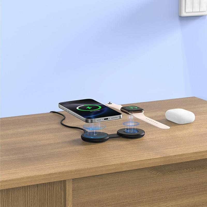 Laden Sie mehrere Geräte gleichzeitig mit dem 25-W-Hauptladepad und einem zweiten 5-W-Lademodul für Ohrhörer oder Smartwatches. Perfekt für einen aufgeräumten Schreibtisch, auf Reisen oder zum Aufladen auf dem Nachttisch.