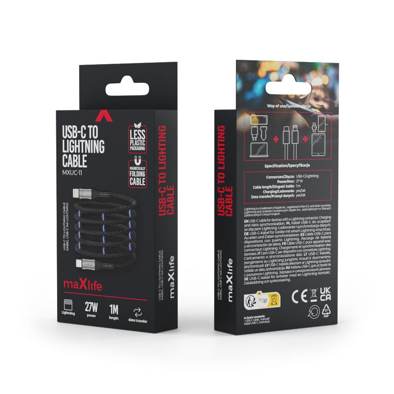 Maxlife MXUC-11 magnetisches USB-C zu Lightning Kabel - 1m, 27W Schnellladung, Nylon geflochten, verstärkte Anschlüsse