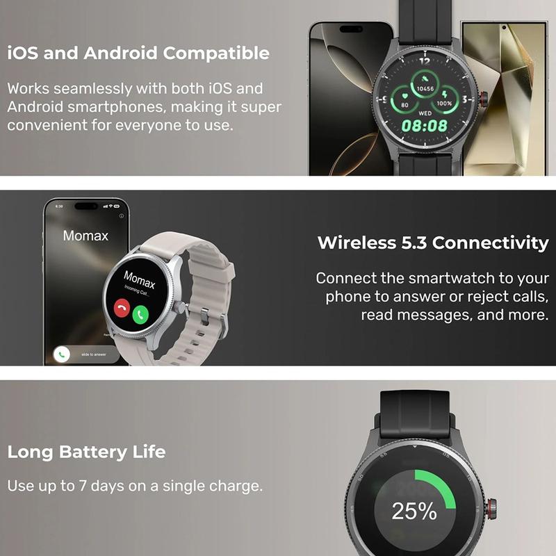 Die MOMAX 1-Wear ist ein starker Allrounder, wenn Sie Gesundheitsdaten, Aktivitäts-Tracking und tägliche Konnektivität in einer Uhr wünschen, die bequem und einfach zu bedienen ist. Sie erhalten ein funktionsreiches Erlebnis - über 100 Sportmodi, KI-Schlafüberwachung und IP68-Schutz - ohne lästiges nächtliches Aufladen, was sie zu einer praktischen Wahl sowohl für fitnessorientierte Nutzer als auch für alle macht, die ein einfaches Wellness-Tracking wünschen.