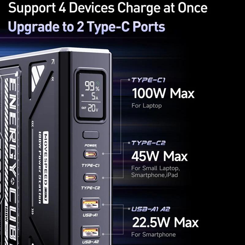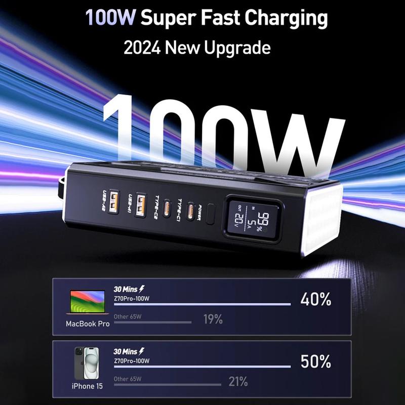 - 100-W-Schnellladeausgang - Unterstützt PD 100-W- und 22,5-W-Schnellladeprotokolle und bietet damit Ladegeschwindigkeiten auf Laptop-Niveau für mehrere Geräte gleichzeitig.