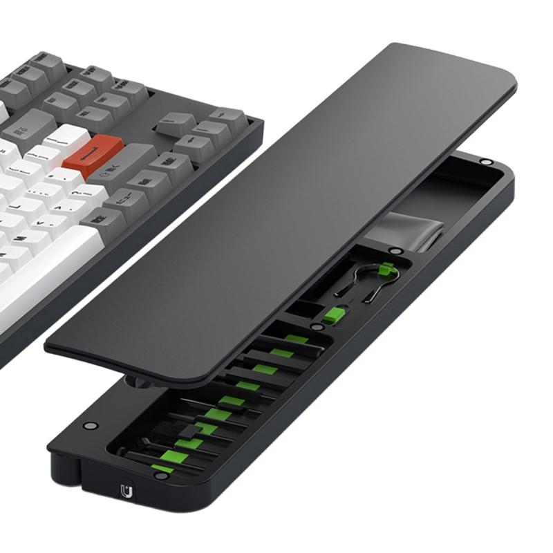 Im Inneren der Handgelenkstütze befindet sich ein komplettes 22-teiliges Reinigungsset, das für die gründliche Reinigung von Tastaturen, Kopfhörern, Handy-Ladeanschlüssen, Kameralinsen, Schaltern und anderen elektronischen Geräten entwickelt wurde. Jedes Werkzeug hat seinen eigenen Platz, was eine einfache Organisation und einen schnellen Zugriff ermöglicht.