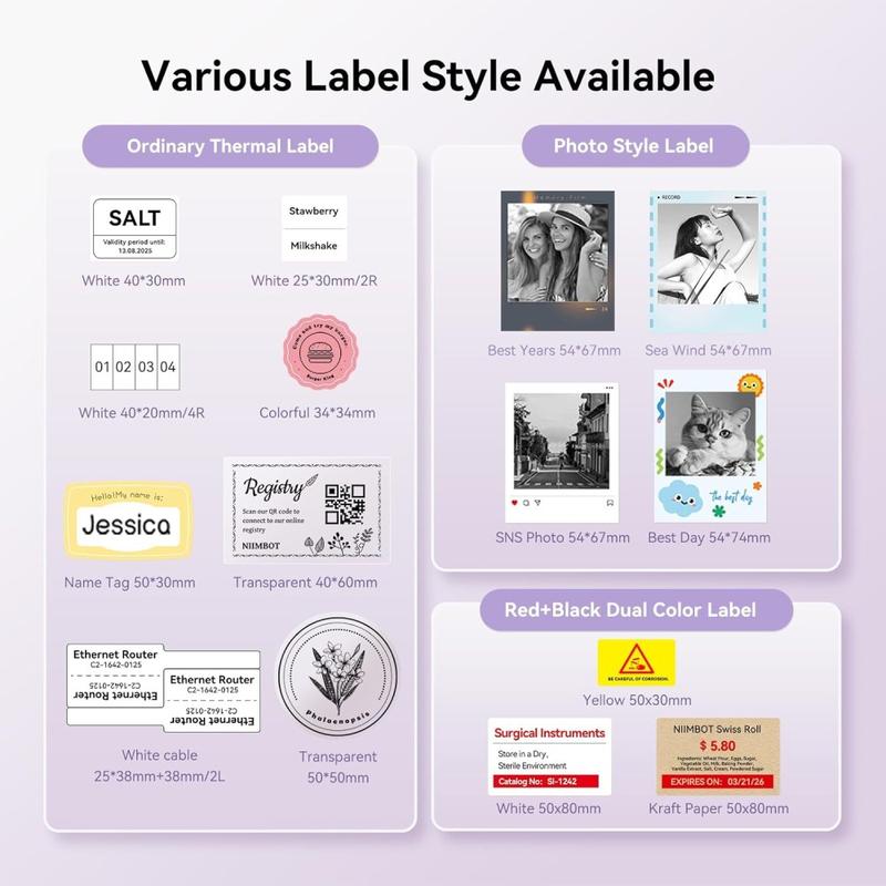 - Kreative Design-App - Mit der NIIMBOT-App haben Sie Zugriff auf mehr als 1500 Symbole, 249 kostenlose Schriftarten und mehr als 1000 Vorlagen sowie auf VIP-exklusive Elemente für eine vollständig individuelle Etikettengestaltung.