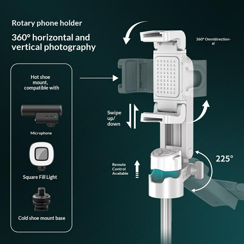 Die Telefonklammer unterstützt eine 360°-Drehung für Hoch- oder Querformataufnahmen und bietet eine 225°-Neigungseinstellung. Dank dieser Flexibilität können Sie kreative Winkel für Vlogs, Gruppenfotos und Social-Media-Inhalte aufnehmen.