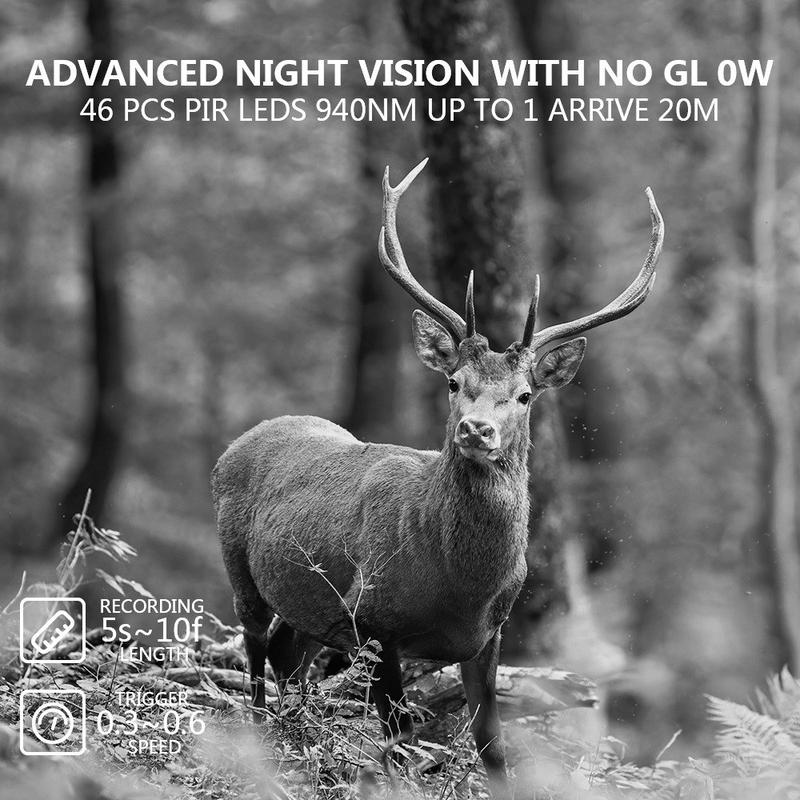 - Fortschrittliche Nachtsicht - Ausgestattet mit 46 Infrarot-LEDs (Wellenlänge 940 nm), die eine Nachtsichtweite von bis zu 20 Metern ermöglichen, ohne dass Wildtiere gestört werden.