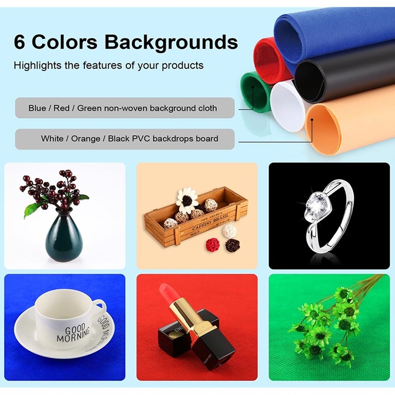 Wird mit einer Tragetasche und 3 Stück Hintergrundpappen (Weiß, Orange, Schwarz) geliefert. Die Papptafeln sind knitterfrei und wasserfest