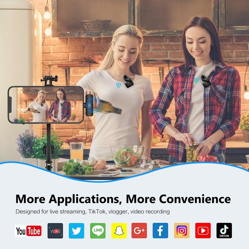 Die Konfiguration mit zwei Mikrofonen ist besonders nützlich, wenn zwei Sprecher gleichzeitig aufgenommen werden müssen, und eignet sich daher ideal für dialogbasierte Videos, Interviews, Podcasts, Online-Unterricht und die gemeinsame Erstellung von Inhalten. Die geringe Latenz sorgt für eine flüssige und natürliche Audioaufnahme, während die integrierte ENC-Funktion Hintergrundgeräusche reduziert und so für klarere Sprachwiedergabe in alltäglichen Umgebungen sorgt. Funktionen wie der Bluetooth-kompatible Modus, die Unterstützung für Smart Mute und die Hallverbesserung bieten zusätzliche Flexibilität für eine kreativere Audioanwendung.