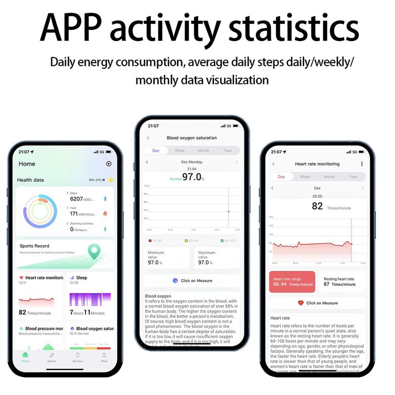 - Umfassendes Gesundheits-Tracking - Überwacht Herzfrequenz, Blutsauerstoff (SpO2), Blutdruck und Schlafmuster.