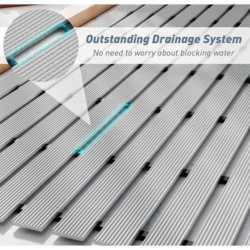 Die Matte ist mit großen, strategisch platzierten Drainageschlitzen ausgestattet, durch die das Wasser schnell abfließen kann, wodurch Staunässe vermieden wird und der Boden schneller trocknet. Dadurch wird auch das Risiko von Schimmelbildung und verstopften Bereichen verringert.
