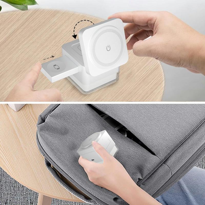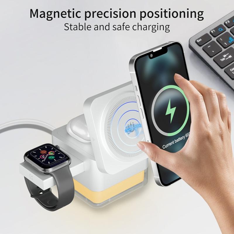 Die magnetische Ausrichtung sorgt dafür, dass kompatible Geräte für einen stabilen Ladevorgang in der richtigen Position bleiben, während das faltbare Design es ermöglicht, die Ladestation einfach in eine Tasche oder einen Rucksack zu verstauen. Außerdem verfügt sie über eine RGB-Umgebungsbeleuchtung, die für einen sanften, dekorativen Lichtschein sorgt und als sanftes Nachtlicht auf dem Schreibtisch oder Nachttisch dienen kann.