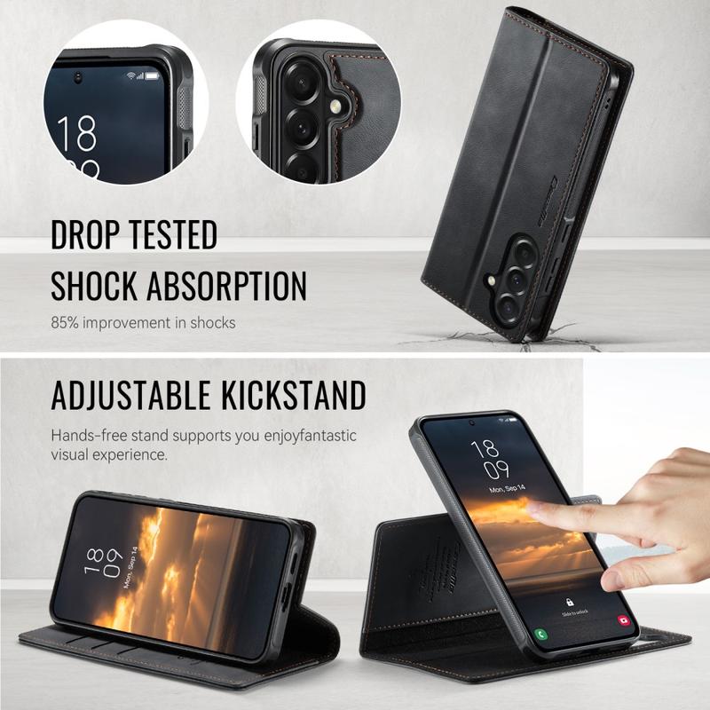 Das CaseMe C49 Wallet Case für das Samsung Galaxy A57 ist aus strapazierfähigem TPU und Polyurethan gefertigt und bietet einen komfortablen Griff und zuverlässigen Schutz vor Stößen, Stürzen und Kratzern im Alltag. Im Inneren sorgt ein weiches Mikrofaserfutter dafür, dass Ihr Gerät makellos bleibt.