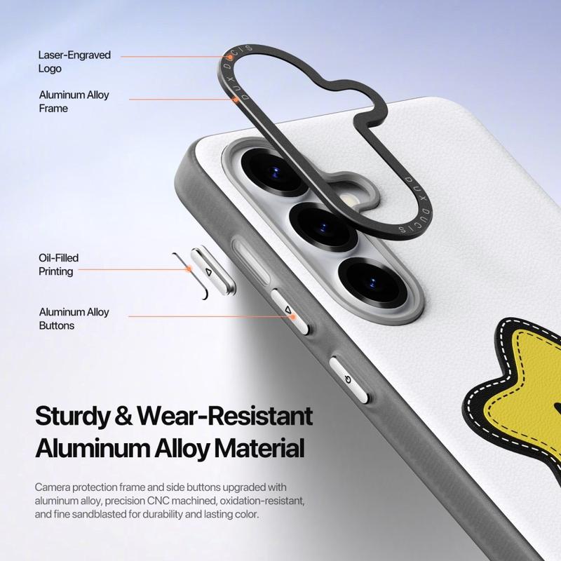 Der Kameraschutzrahmen und die seitlichen Tasten sind aus einer Aluminiumlegierung gefertigt, präzise CNC-gefräst und mit feinem Sandstrahlen veredelt. Dies sorgt für eine lang anhaltende Farbe, Haltbarkeit und eine hochwertige Haptik, die durch dezente lasergravierte Details noch verstärkt wird.