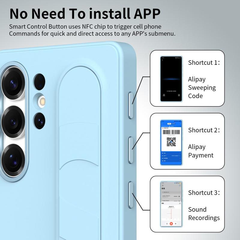 Ausgestattet mit drei intelligenten NFC-fähigen Tasten ermöglicht diese intelligente Hybrid-Hülle den schnellen Zugriff auf Apps wie Kamera, Blitzlicht oder Screenshot mit einem einzigen Druck. Kein Aufladen, keine zusätzlichen Apps - nur einfache, sofortige Funktionalität.