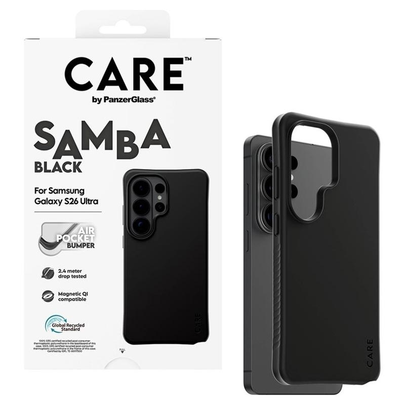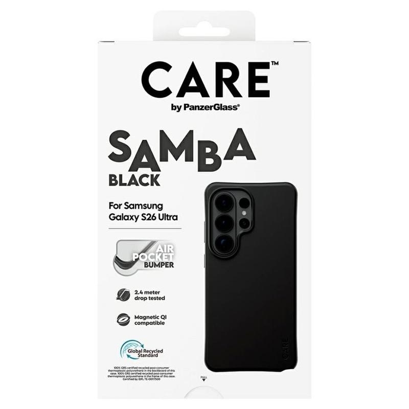 Verleihen Sie Ihrem Samsung Galaxy S26 Ultra ein stilvolles Upgrade und schützen Sie es gleichzeitig Tag für Tag. Die CARE by PanzerGlass Qi Samba-Hülle besteht zu 100 % aus recyceltem TPU und wurde entwickelt, um alltäglichen Stößen, Stürzen und Kratzern standzuhalten, ohne dabei an Komfort einzubüßen. Der verbesserte Eckenschutz hilft, Stöße zu absorbieren, während die griffige Oberfläche sich angenehm anfühlt und das Samsung Galaxy S26 Ultra sicherer in der Hand hält.