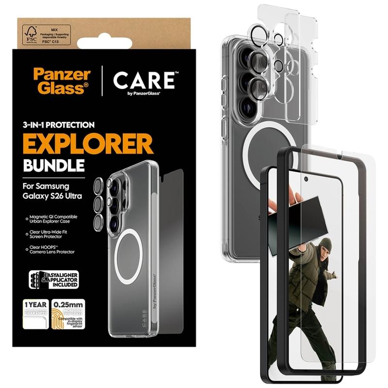Care by PanzerGlass 3-in-1 Explorer Bundle für Samsung Galaxy S26 Ultra - Displayschutzfolie + Hoops-Objektivschutz + Urban Combat Magnethülle, EasyAligner