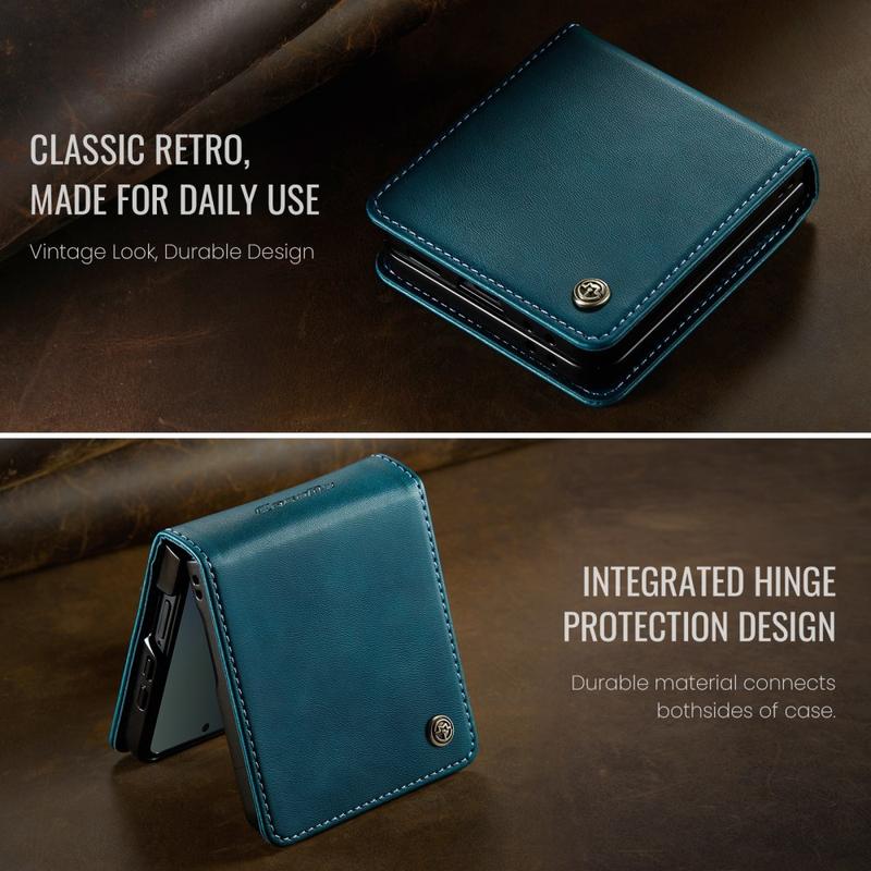 Das CASEME 033 Series Wallet Case für das Samsung Galaxy Z Flip7 besteht aus Polyurethan mit Kalbslederstruktur in Kombination mit TPU und bietet umfassenden Schutz vor Kratzern, Stößen und täglicher Beanspruchung, während es gleichzeitig ein hochwertiges, elegantes Aussehen bewahrt.