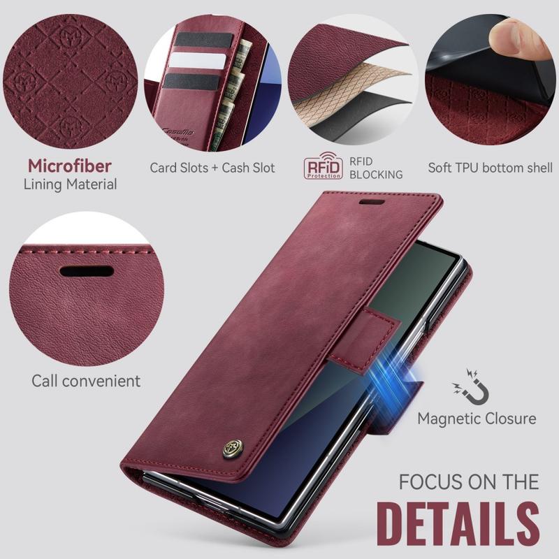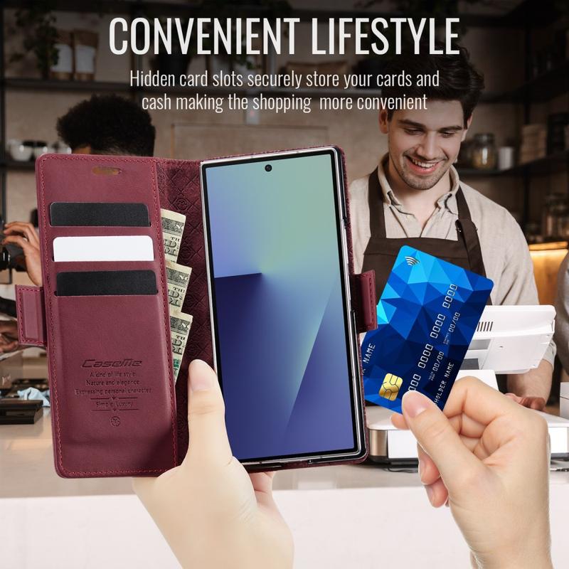 Das CASEME 033 Series Wallet Case für das Samsung Galaxy Z Fold7 ist aus Polyurethan mit Kalbslederstruktur und TPU gefertigt. Es bietet Schutz vor Kratzern, Stößen und täglicher Beanspruchung und sieht dabei elegant und hochwertig aus.