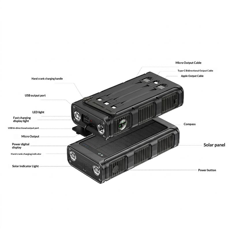 Der leistungsstarke 30.000-mAh-Akku unterstützt mehrere Ladezyklen für Smartphones, kleine Gadgets und andere Alltagsgeräte. Außerdem verfügt er über PD-Schnellladung mit 20 W, zwei Ausgangsanschlüsse sowie integrierte Typ-C-, Micro-USB- und Lightning-Kabel, sodass Sie bequemer aufladen können, ohne zusätzliche Kabel mitnehmen zu müssen. Für noch mehr Praktikabilität im Freien sind eine helle LED-Taschenlampe, ein SOS-Alarm und ein Kompass enthalten.